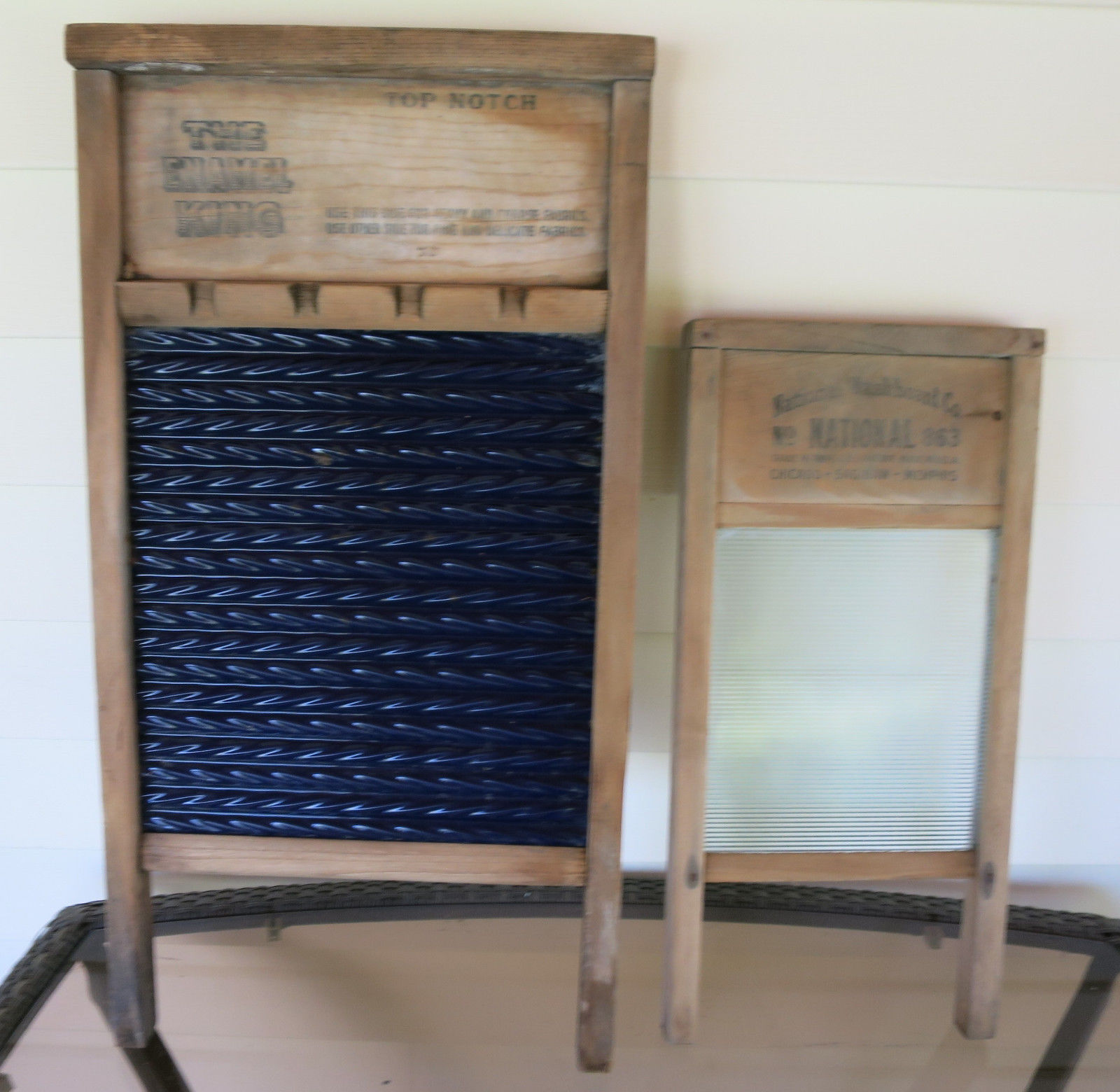 ONE BLUE ENAMEL AND ONE GLASS VINTAGE WASH BOARDS