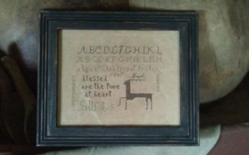 Primitive Sampler.....Early look cross stitch....Pure in Heart Framed Sampler