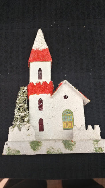 Title (ebay affiliate link): Vintage Cardboard Christmas Green Spot Japan putz house Church RARE Paper 1940s