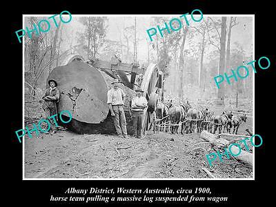 OLD LARGE HISTORIC PHOTO OF ALBANY WA, HORSE TEAM PULLING A MASSIVE LOG c1900