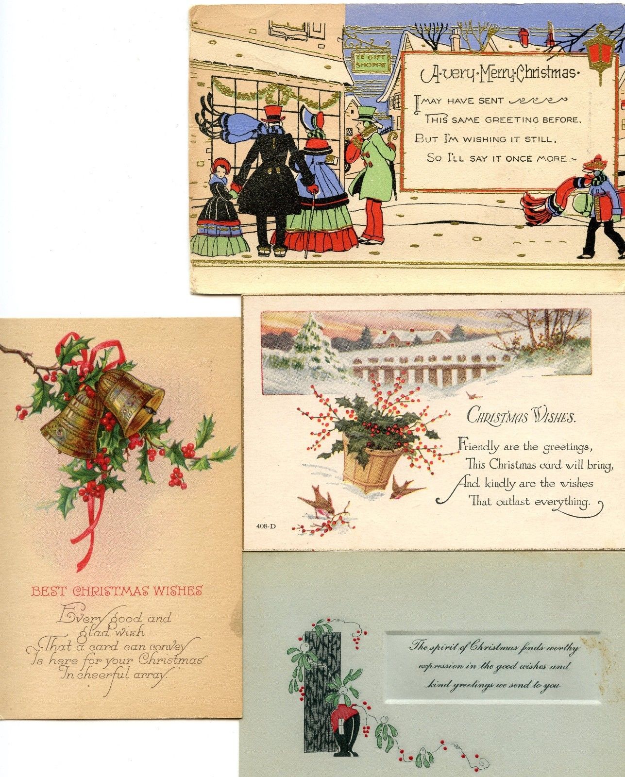 4 Christmas, 3 are postcards, Bells, Holly, Vase, Birds, Gift Shop with shoppers