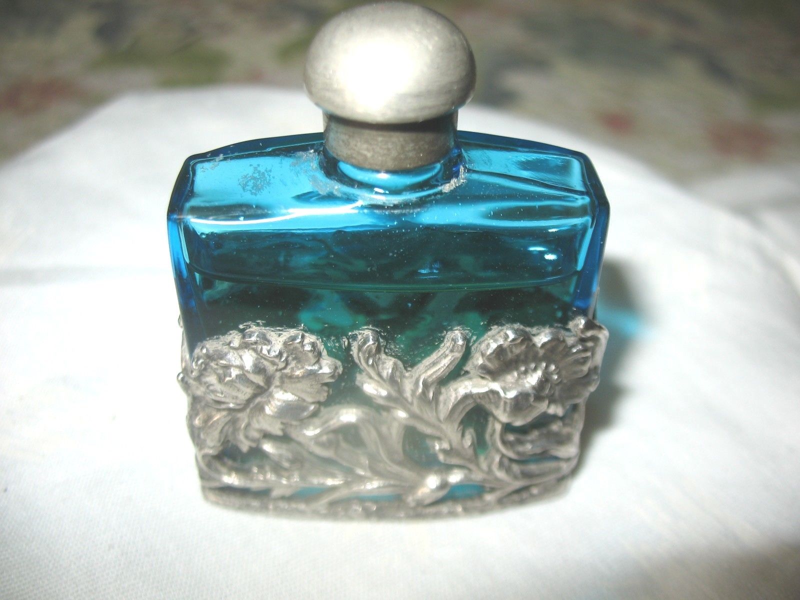 Antique Cobalt Blue Glass & Applied Silver Flowers Perfume Bottle