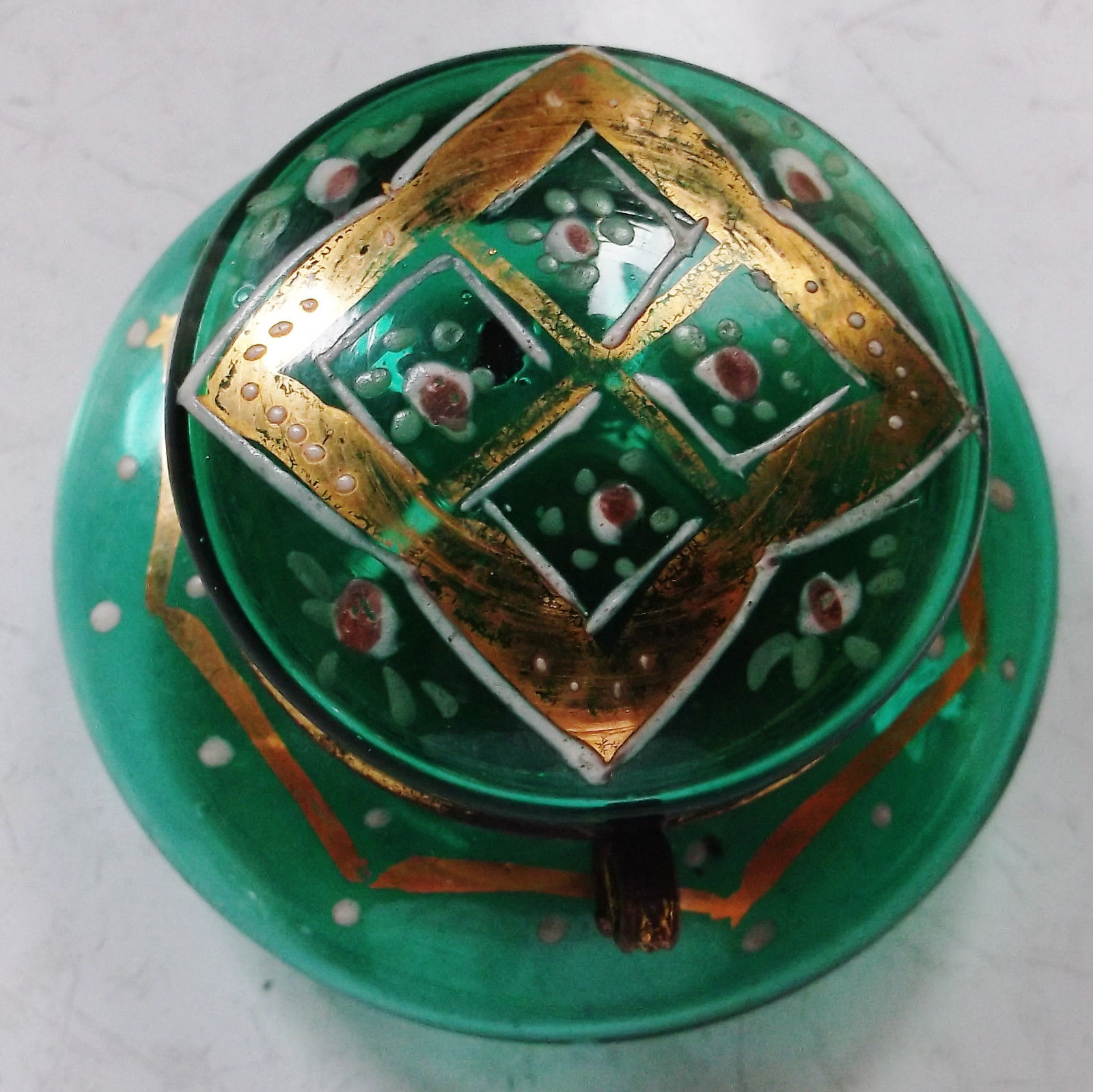 Title (ebay affiliate link): VERY LOVELY MINIATURE 2" ANTIQUE VICTORIAN ENAMELED GREEN GLASS VANITY JAR