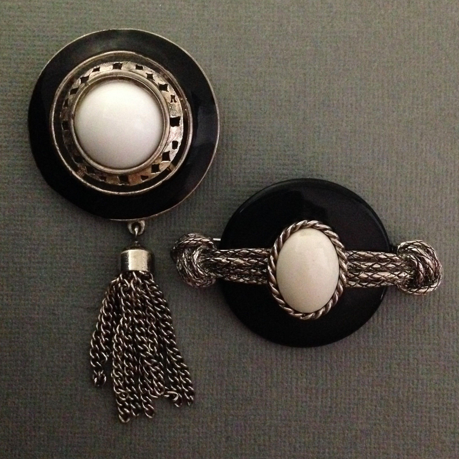 Title (ebay affiliate link): Deco Disks- Vintage Silver Tone, Enamel & Milk Glass Brooches/Pins
