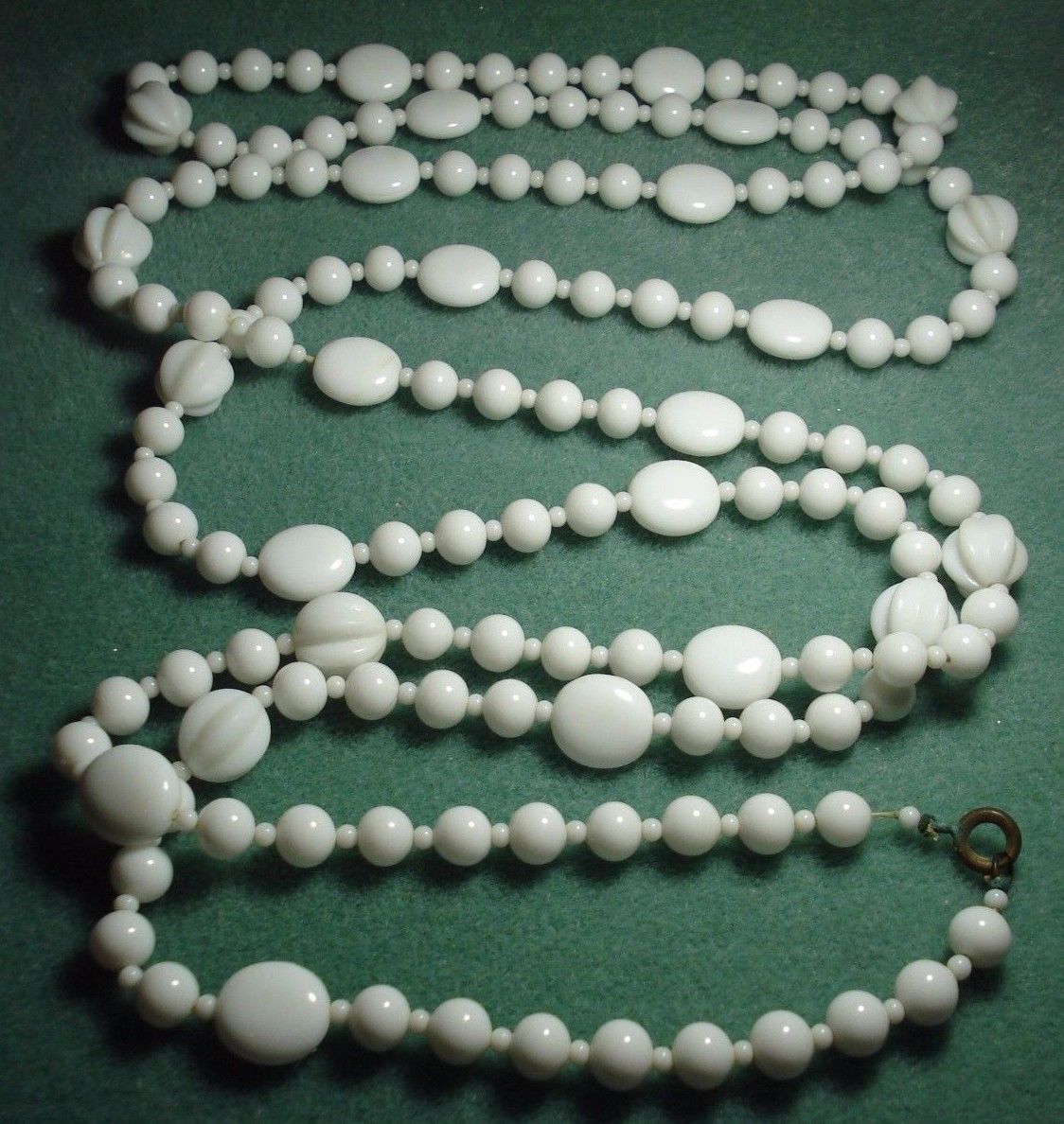 Title (ebay affiliate link): Vintage Flapper Length White Milk Glass Bead Strung Necklace Over 5 Feet 62 1/2"