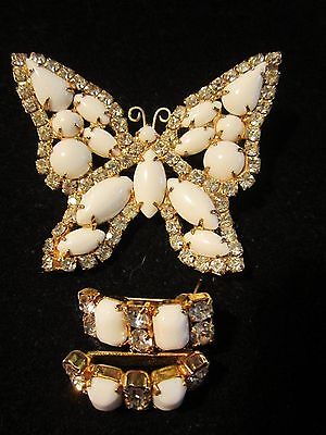 Vintage Milk Glass & Rhinestone Butterfly Brooch&Milk Glass& Rhinestone Earrings