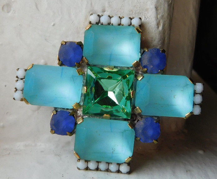 Title (ebay affiliate link): XXL VINTAGE CZECH HANDMADE RHINESTONE BUTTON~AQUA FROST~BLUE~PERIDOT~MILK GLASS