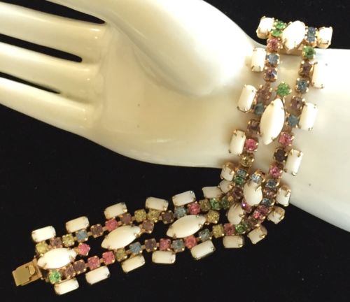 Title (ebay affiliate link): Vintage Estate WEISS Milk Glass Pastel Rhinestones Gold Tone Bracelet
