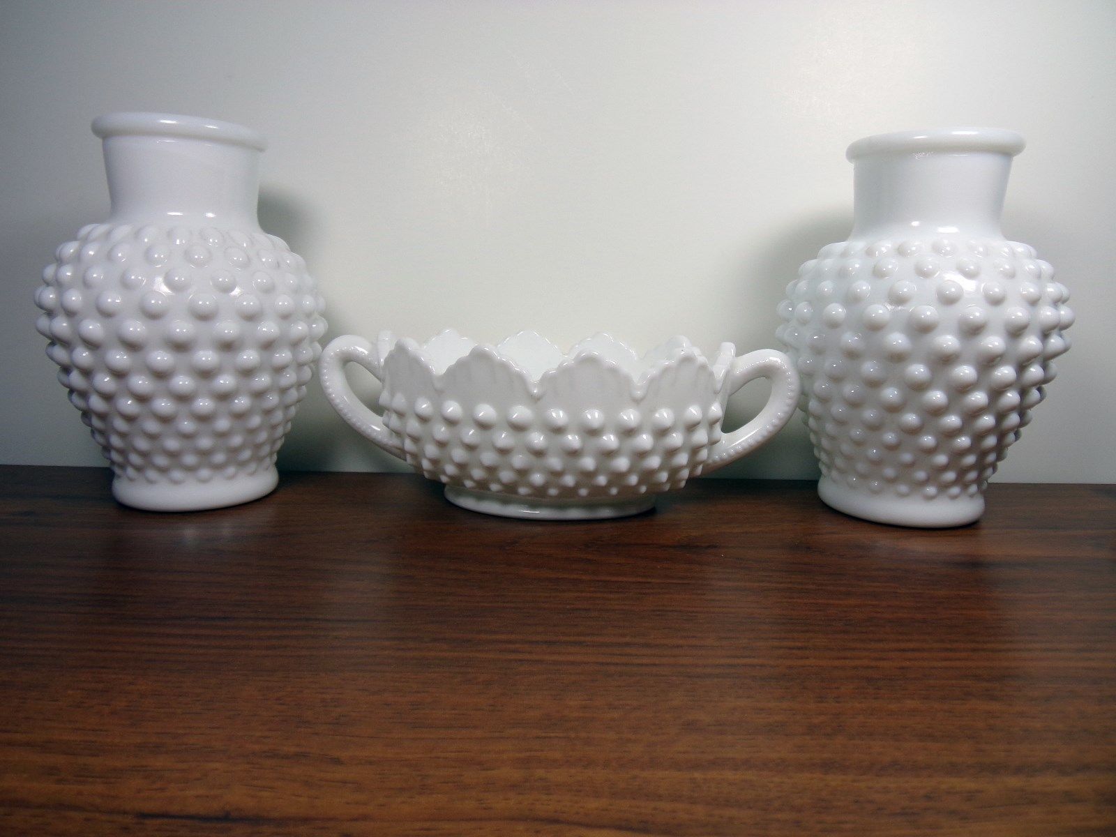 Title (ebay affiliate link): Vintage 2 Hobnail Milk Glass Small Vases and 1 Sugar/Gravy Bowl Set