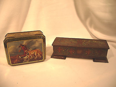 Tin Boxes Lot 2 Hand Painted Hinged Lids Feet Vintage Germany Hunter Stag Dogs