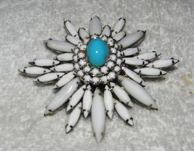 STUNNING MILK GLASS W/TOURQUOIS GLASS STONE PIN/PENDANT
