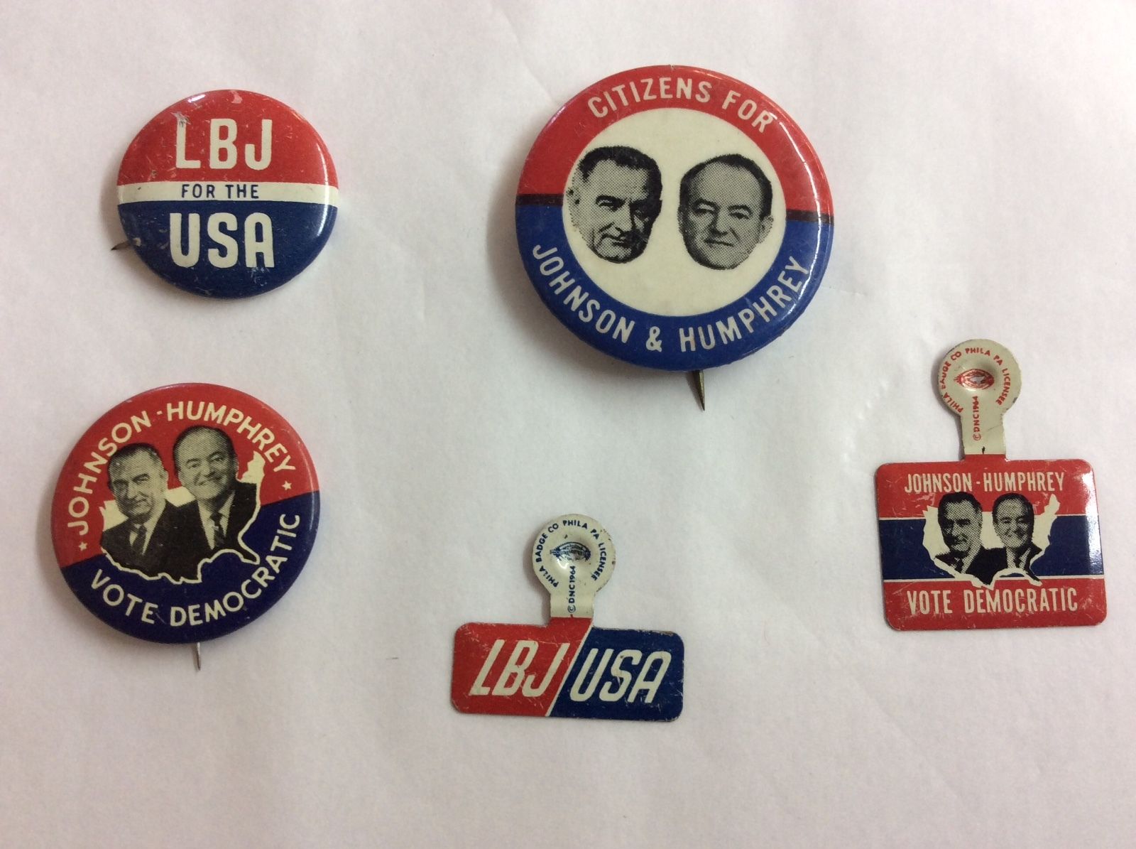 Lot of Five 1964 Presidental Campaign Pinbacks and Fold Overs Johnson & Humphrey