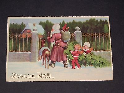 Vintage JOYEUX NOEL Christmas Postcard SANTA KIDS DEER TREE TOY