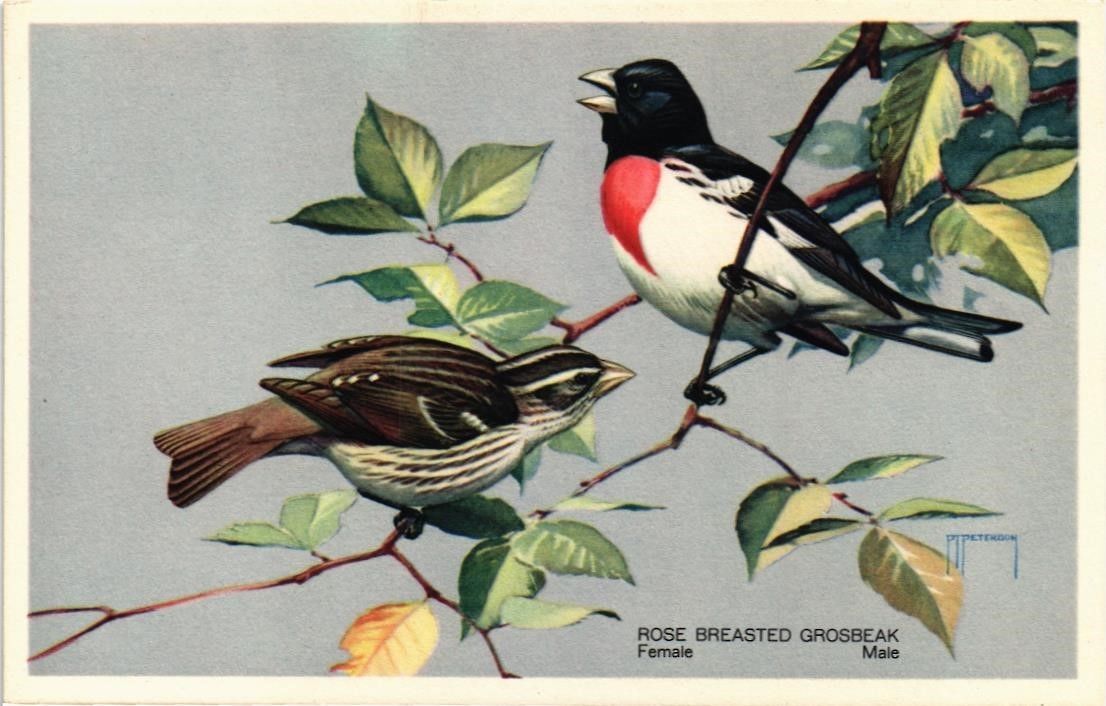 DR JIM STAMPS US ROSE BREASTED GROSBEAK MALE FEMALE BIRDS WILDLIFE POSTCARD
