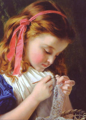 Title (ebay affiliate link): ART~ Sophie Anderson LITTLE GIRL KNITTING Needle Pink ribbon KIDS postcard