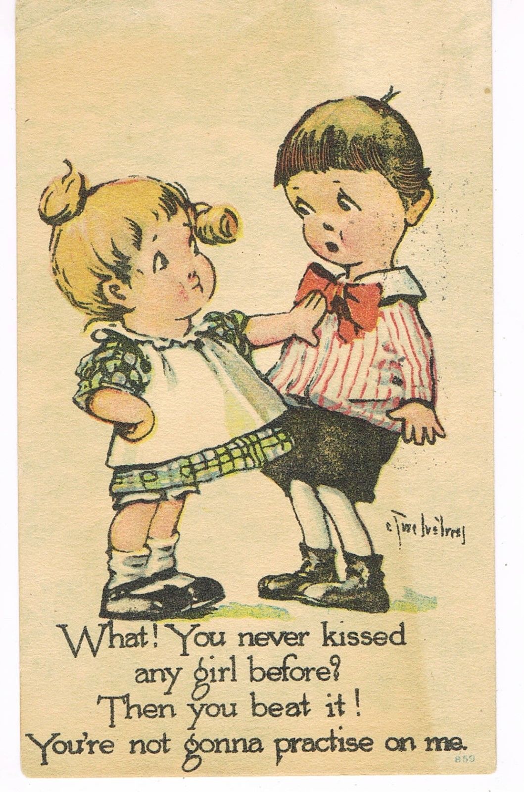 Title (ebay affiliate link): ANTIQUE (C. TWELVETREES) Postcard "WHAT! YOU NEVER KISSED ANY GIRL BEFORE?"