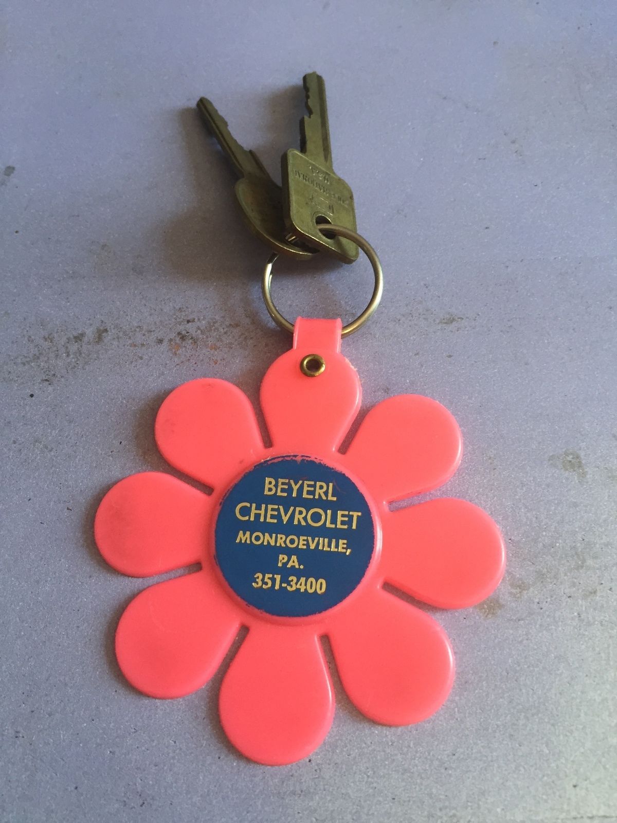 VINTAGE BEYERL CHEVROLET 70s PLASTIC FLOWER KEY FOB with 2 KEYS MONROEVILLE, PA