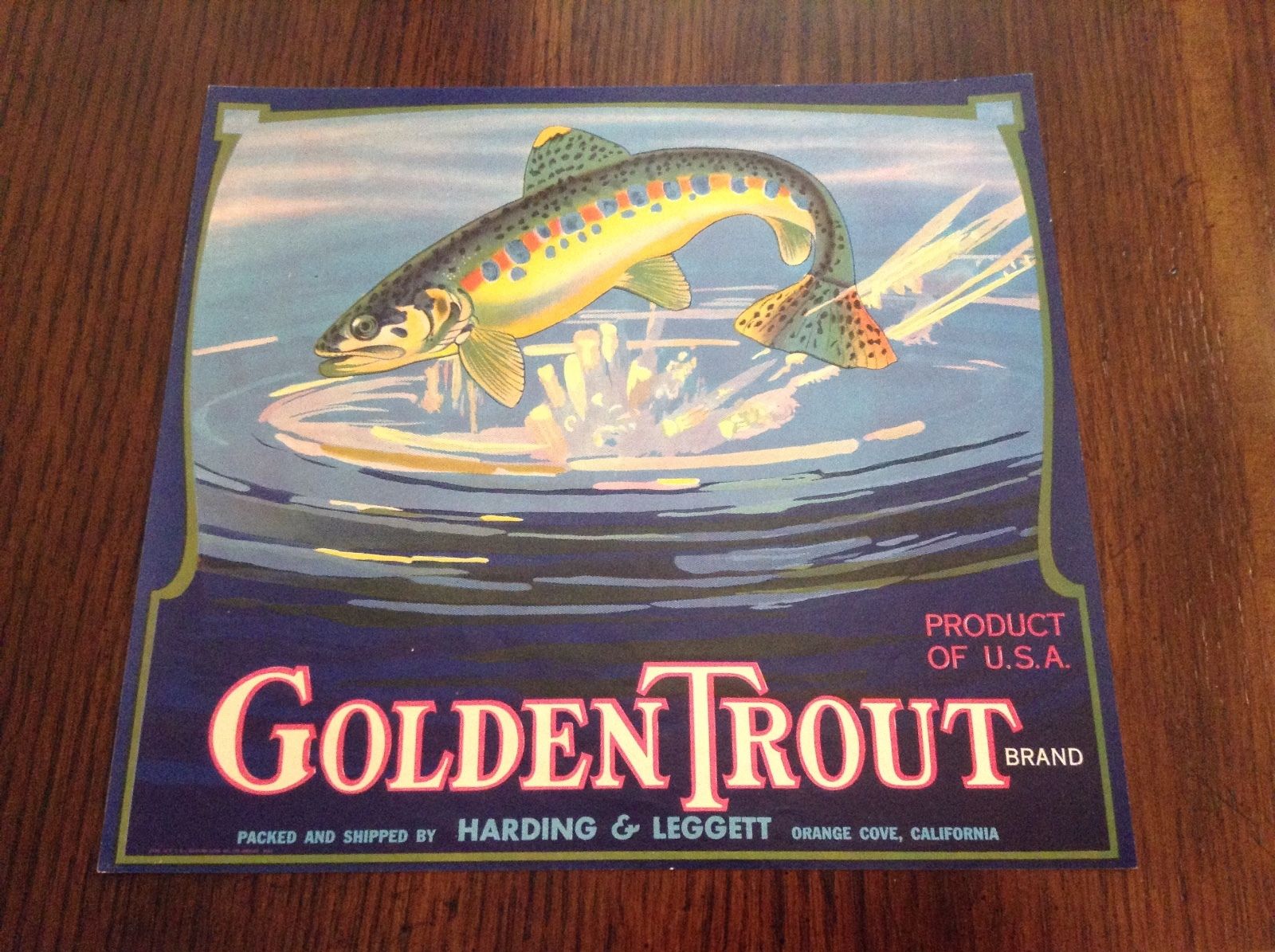 Old vintage Golden Trout orange citrus crate label California kitchen wall art