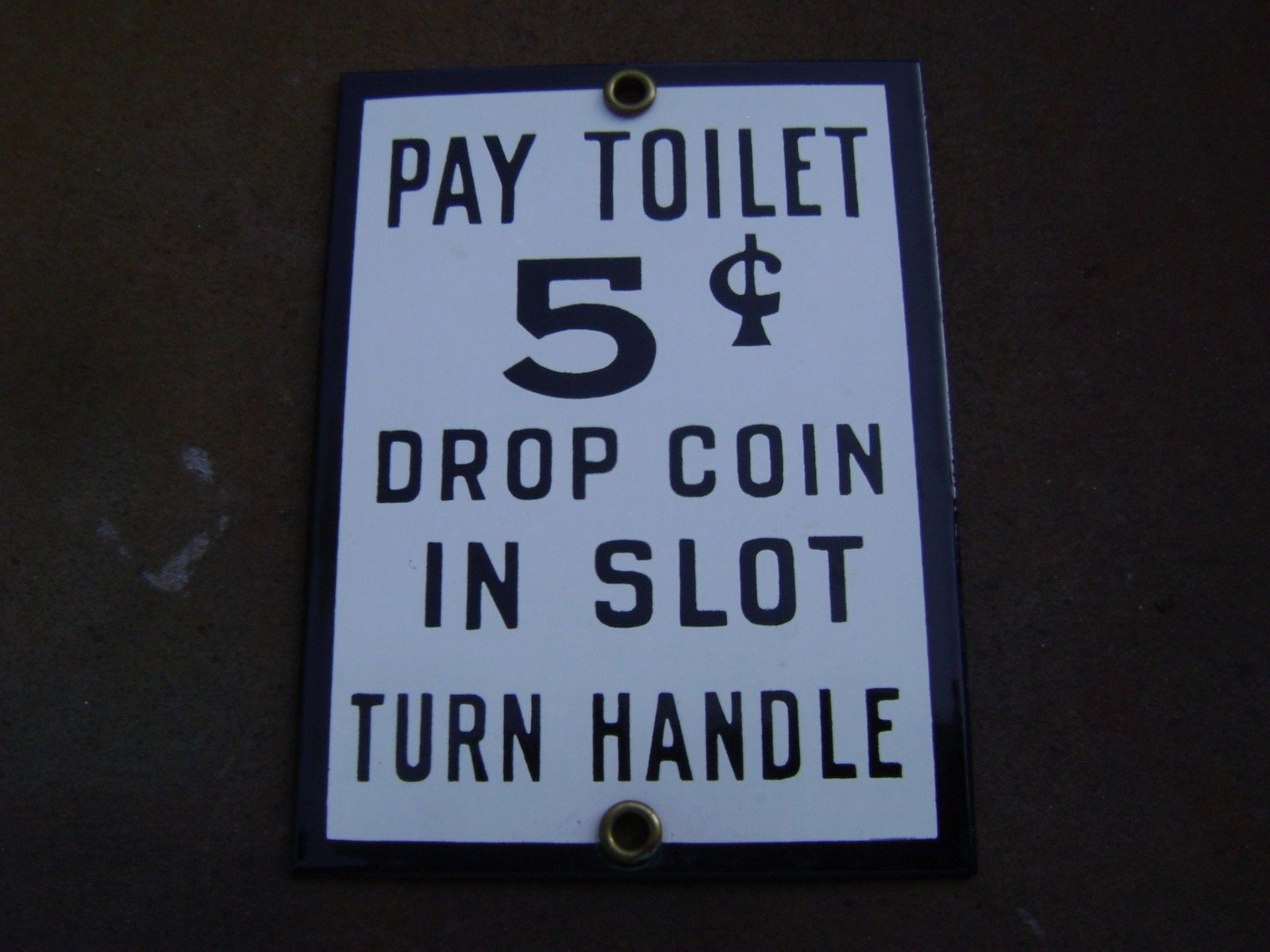 Ande Rooney PAY TOILET 5 CENTS Porcelain sign 3 3/4" x 5"