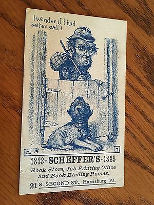 Old 1885 Trade Card Scheffer''s Book & Stationery Store Harrisburg PA. Hobo & Dog