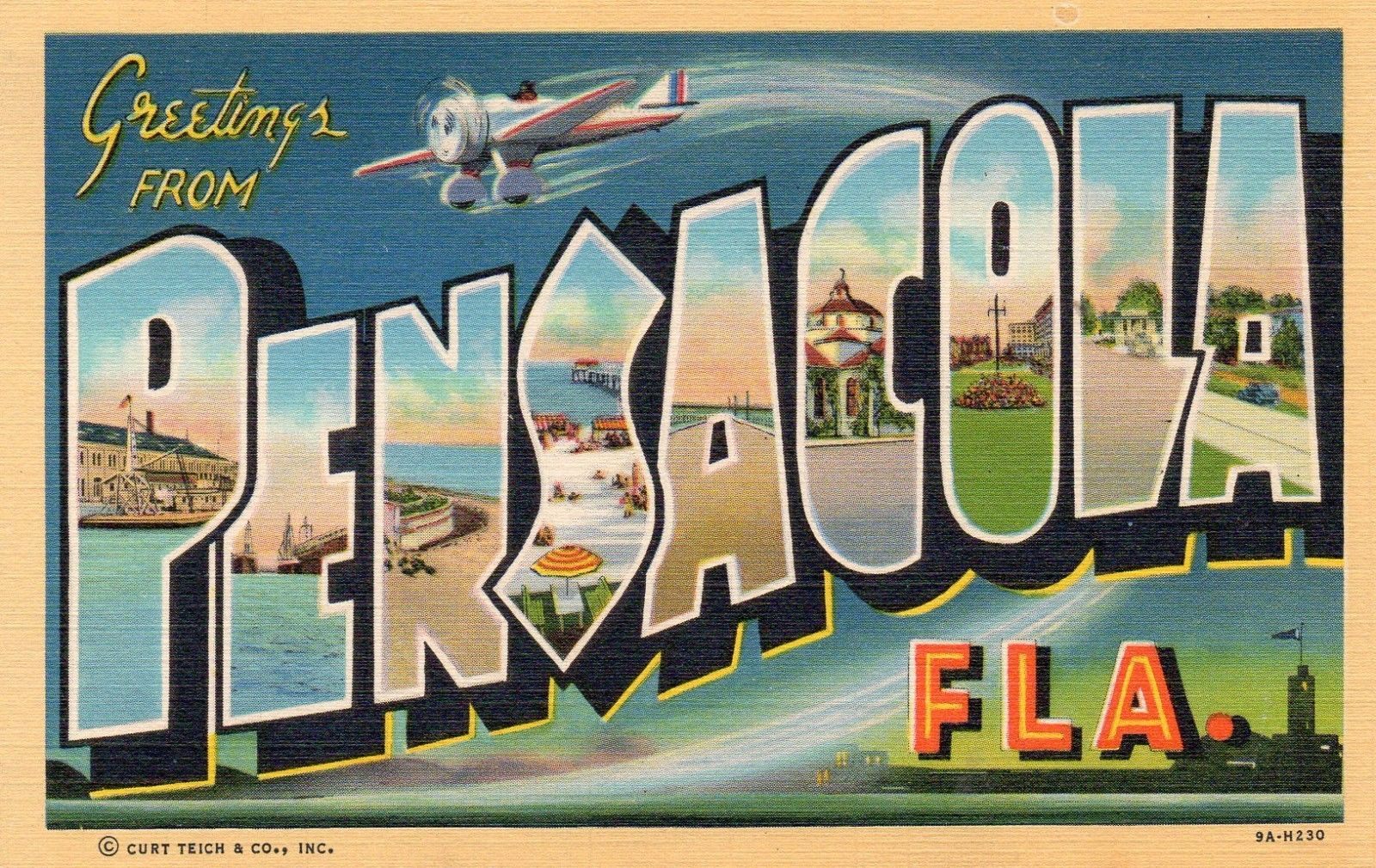 Title (ebay affiliate link): Greetings from Pensacola Fla Curt Teich 1939 used 1940 Large Letter