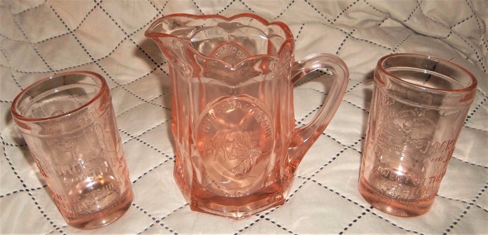 Title (ebay affiliate link): Vintage Tiara Pink Depression Nursery Rhymes Pitcher Glasses Set Jack & Jill AND