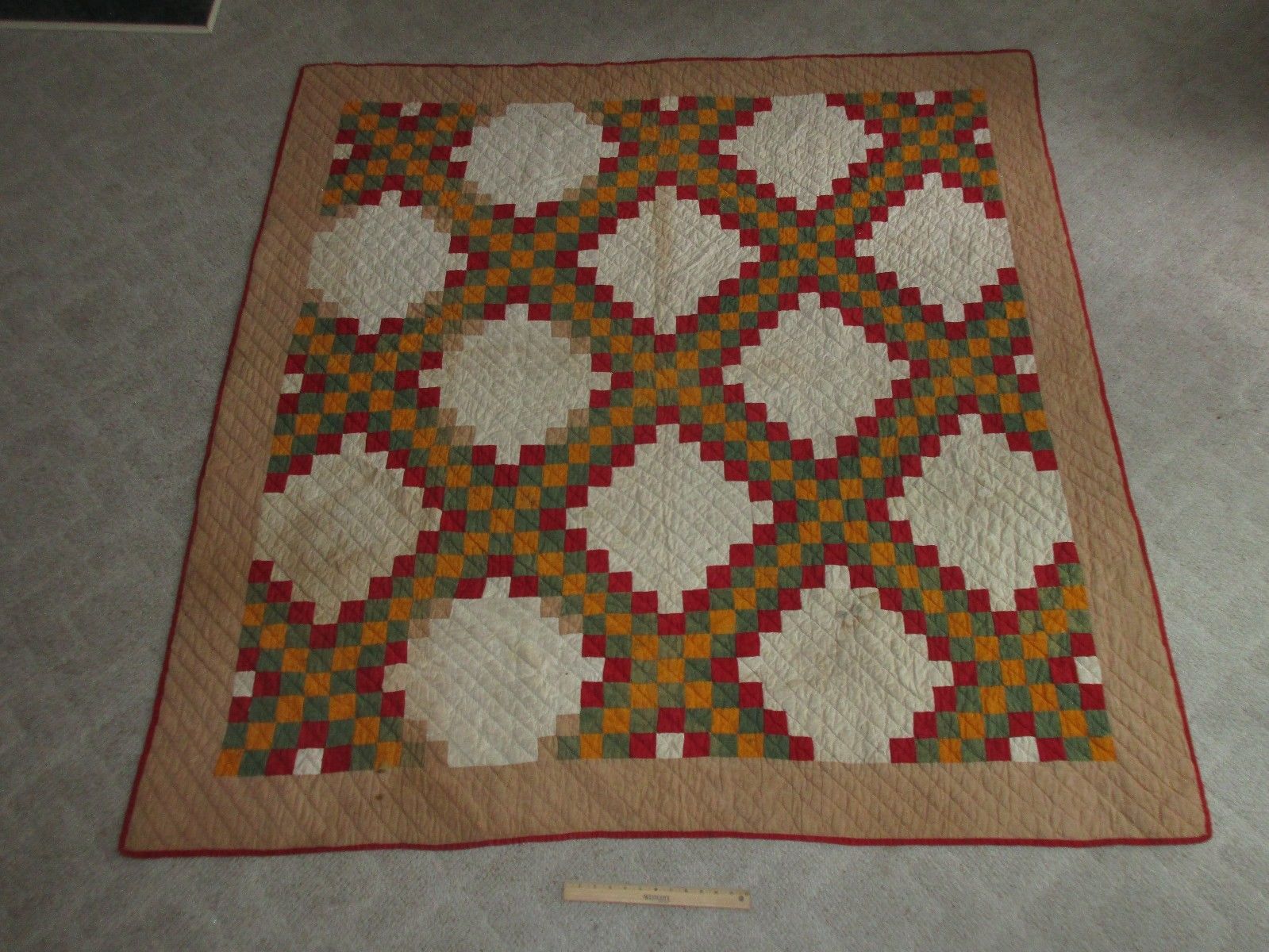 Title (ebay affiliate link): Antique Hand Sewn Red Yellow & Green Irish Chain Block Patchwork Decorated Quilt