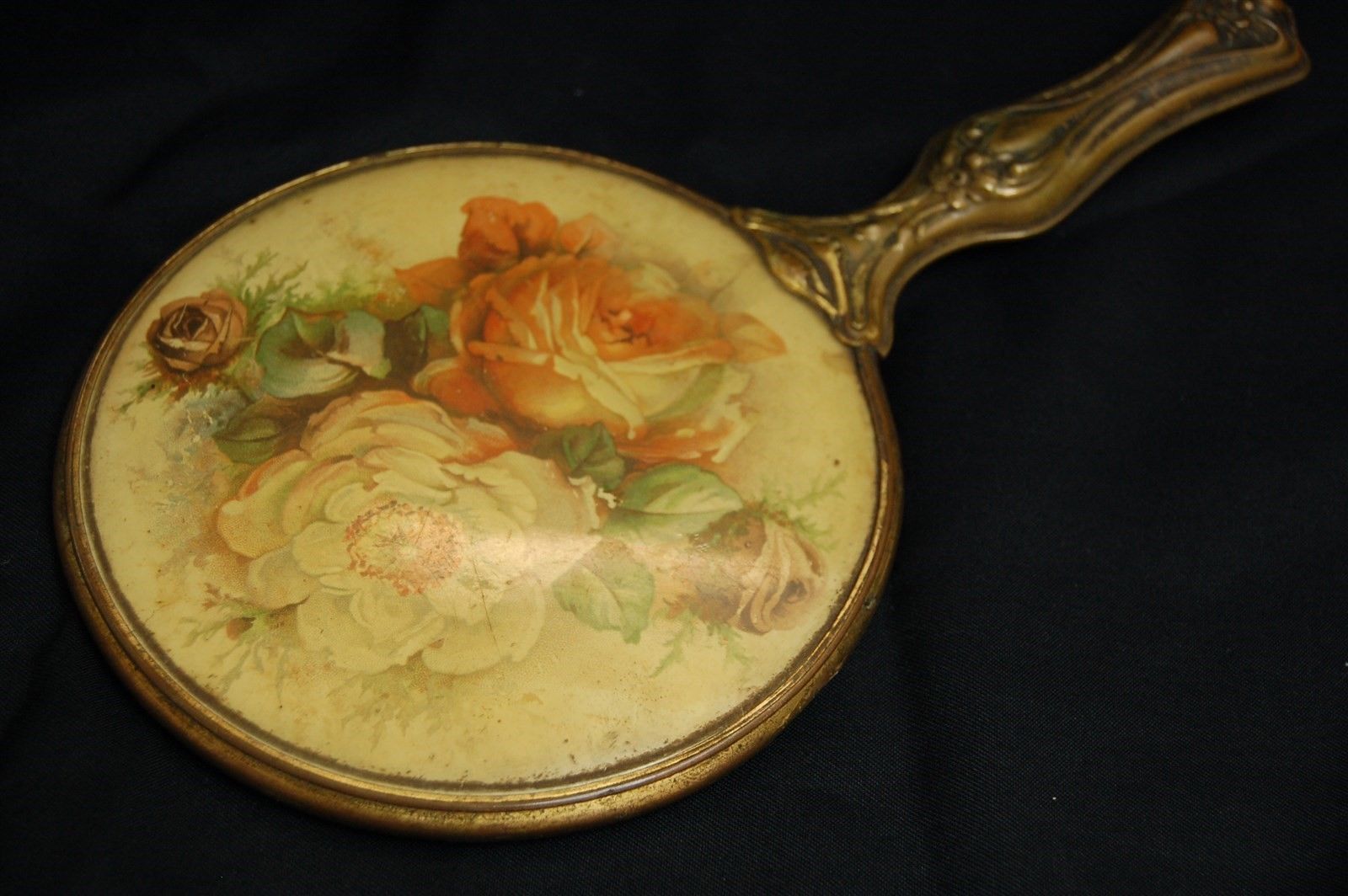 Antique Vanity Hand Held Brass Color Garden Roses Mirror