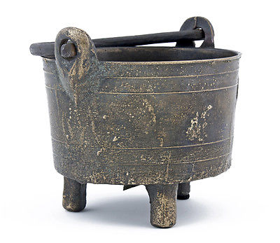DIMINUTIVE 17TH C BRONZE COOKING KETTLE IRON HANDLE