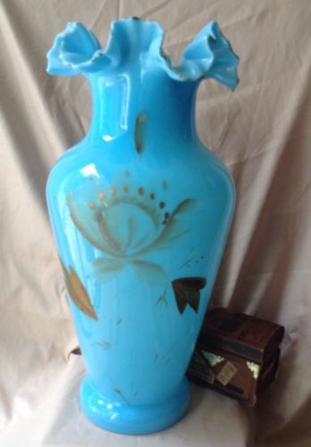 Title (ebay affiliate link): Antique 19th C Bristol Opaline Large Vase W/ Ruffle Top Pontil Mark Blue
