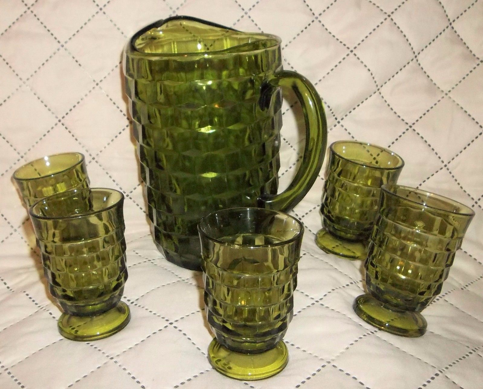 Title (ebay affiliate link): Vintage Set Indiana Colony WHITEHALL Green Pitcher w/ 5 Glasses Cube Pattern and