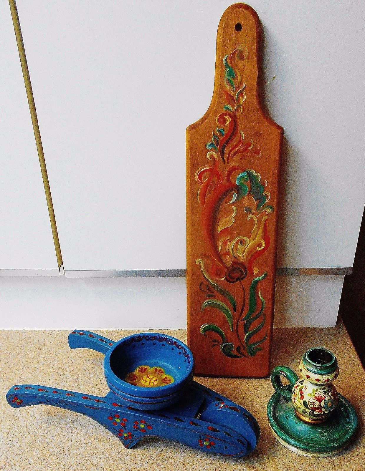 Lot 3 Norwegian Rosemaling Cart w Bowl Candle Holder Wall Board