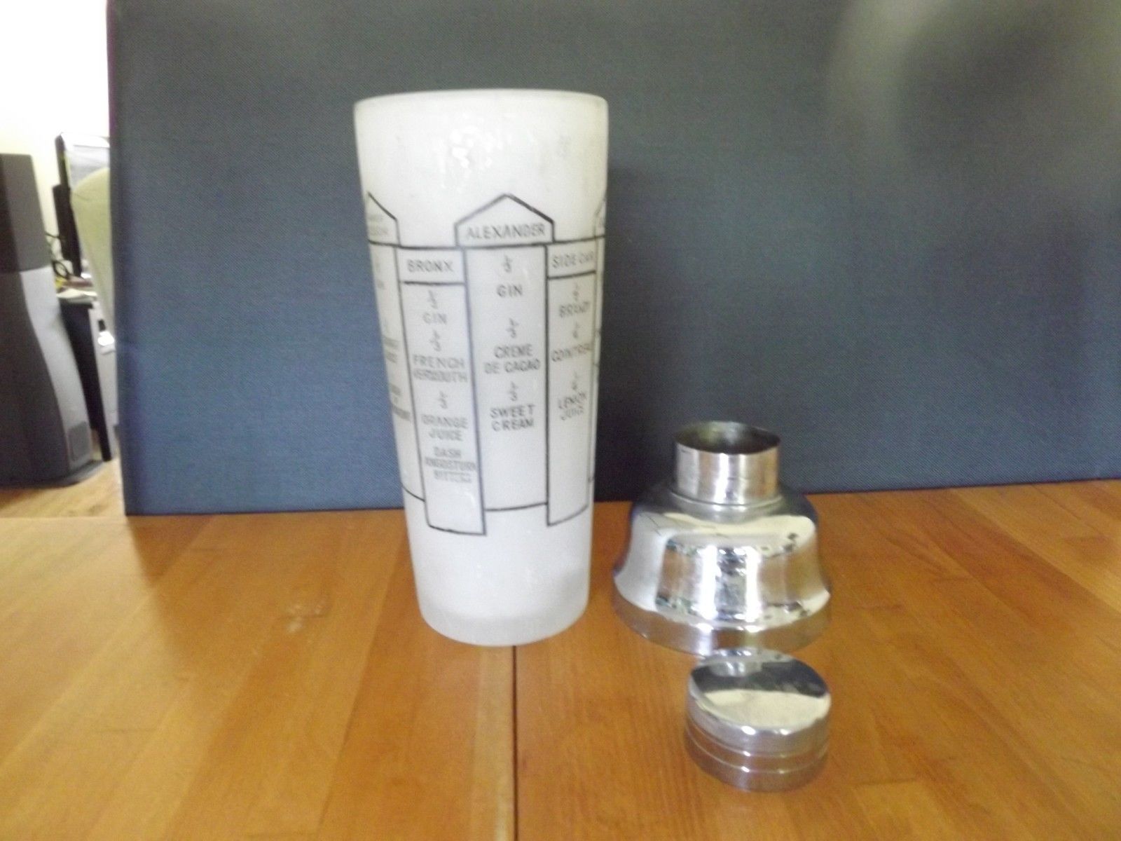 Title (ebay affiliate link): VINTAGE FROSTED COCKTAIL MARTINI SHAKER W/10 RECIPES