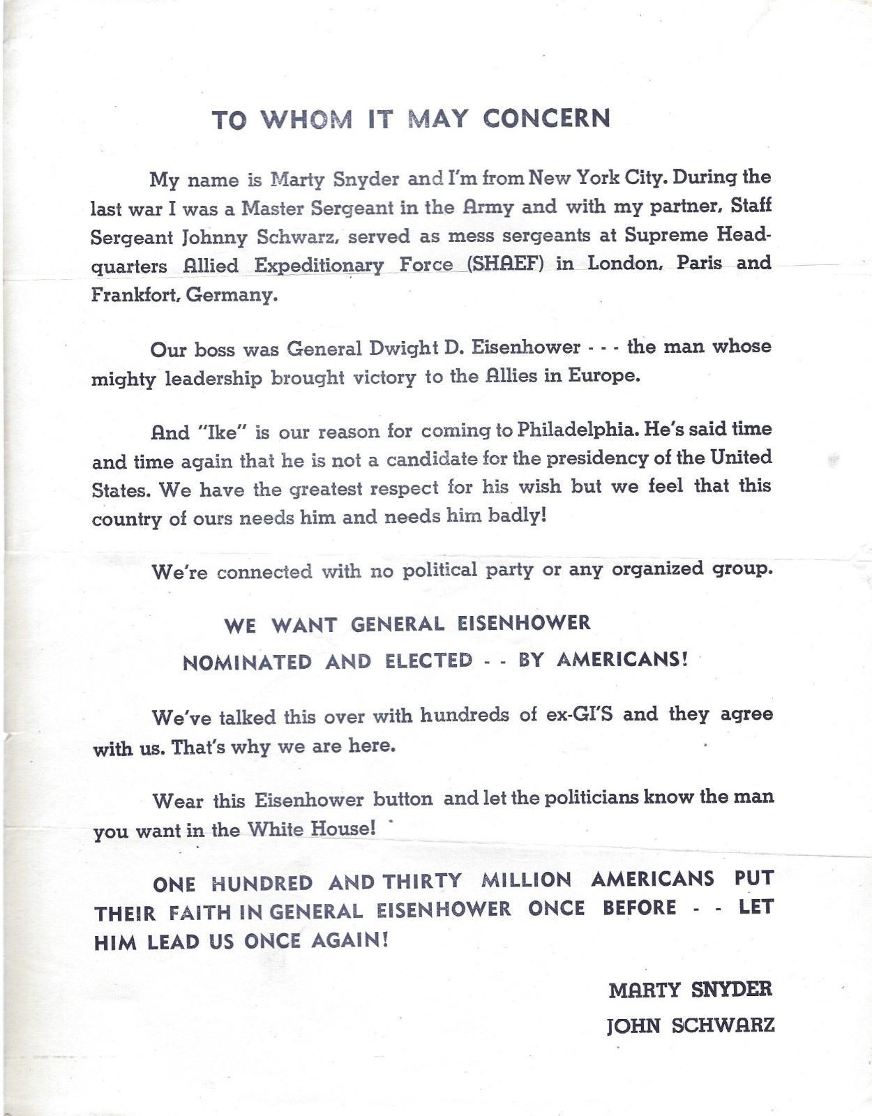 UNUSUAL 1948 DRAFT GENERAL EISENHOWER FOR PRESIDENT CAMPAIGN LETTER