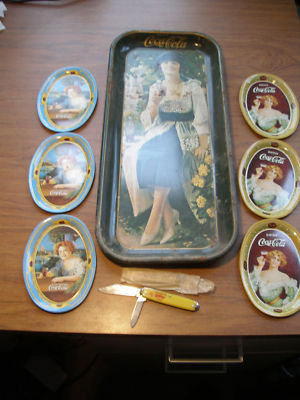 Title (ebay affiliate link): 7 vintage Coca Cola trays and 1 NIP pocket knife