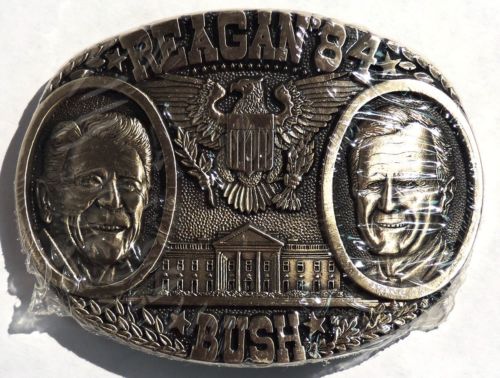 S150. Vintage: REAGAN/BUSH ''84 Limited Edition Solid Brass Belt Buckle (1984)}