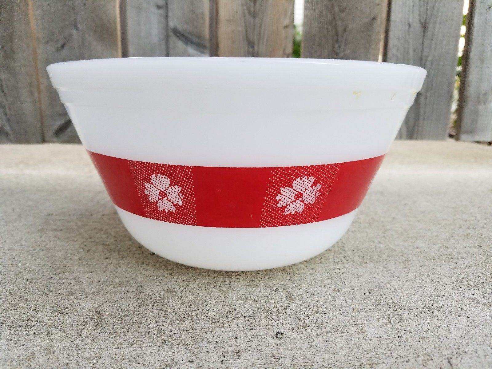 Title (ebay affiliate link): Vintage Federal Milk Glass Red & White Daisy Gingham Mixing Bowl