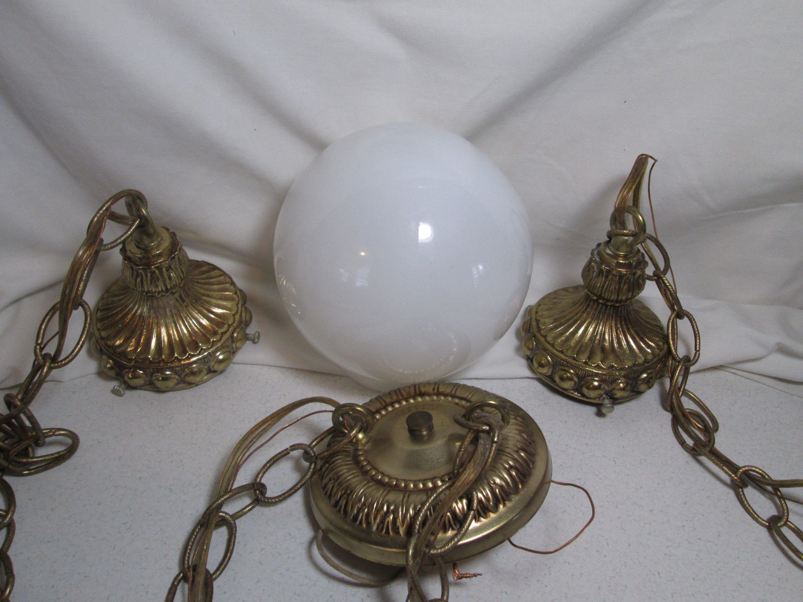 Title (ebay affiliate link): Vtg Mid Century Double Hanging Light Swag Lamp Milk Glass Globe