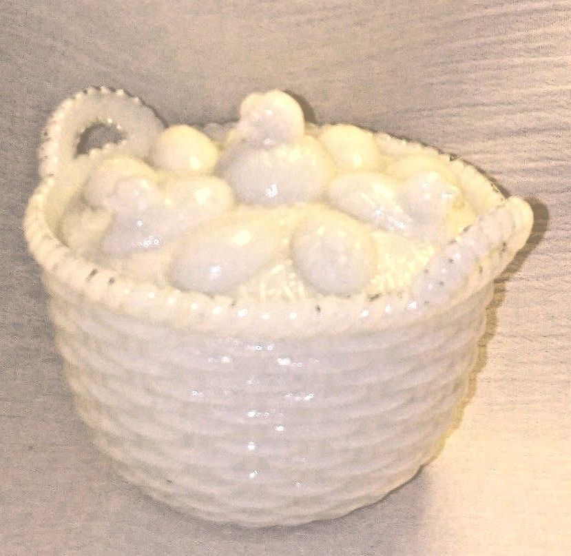 Title (ebay affiliate link): WESTMORELAND GLASS CHICKS HATCHING ON ROUND BASKET WHITE MILK GLASS