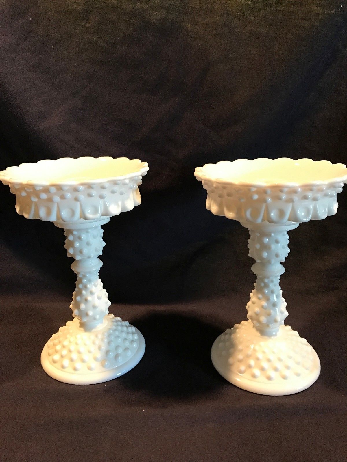 Title (ebay affiliate link): Vintage Milk Glass Hobnail Candle Holders STUNNING Fenton 2 Options