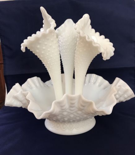 Title (ebay affiliate link): Vtg Fenton White Milk Glass Diamond Lace 3 Horn Vase Bowl Epergne Centerpiece