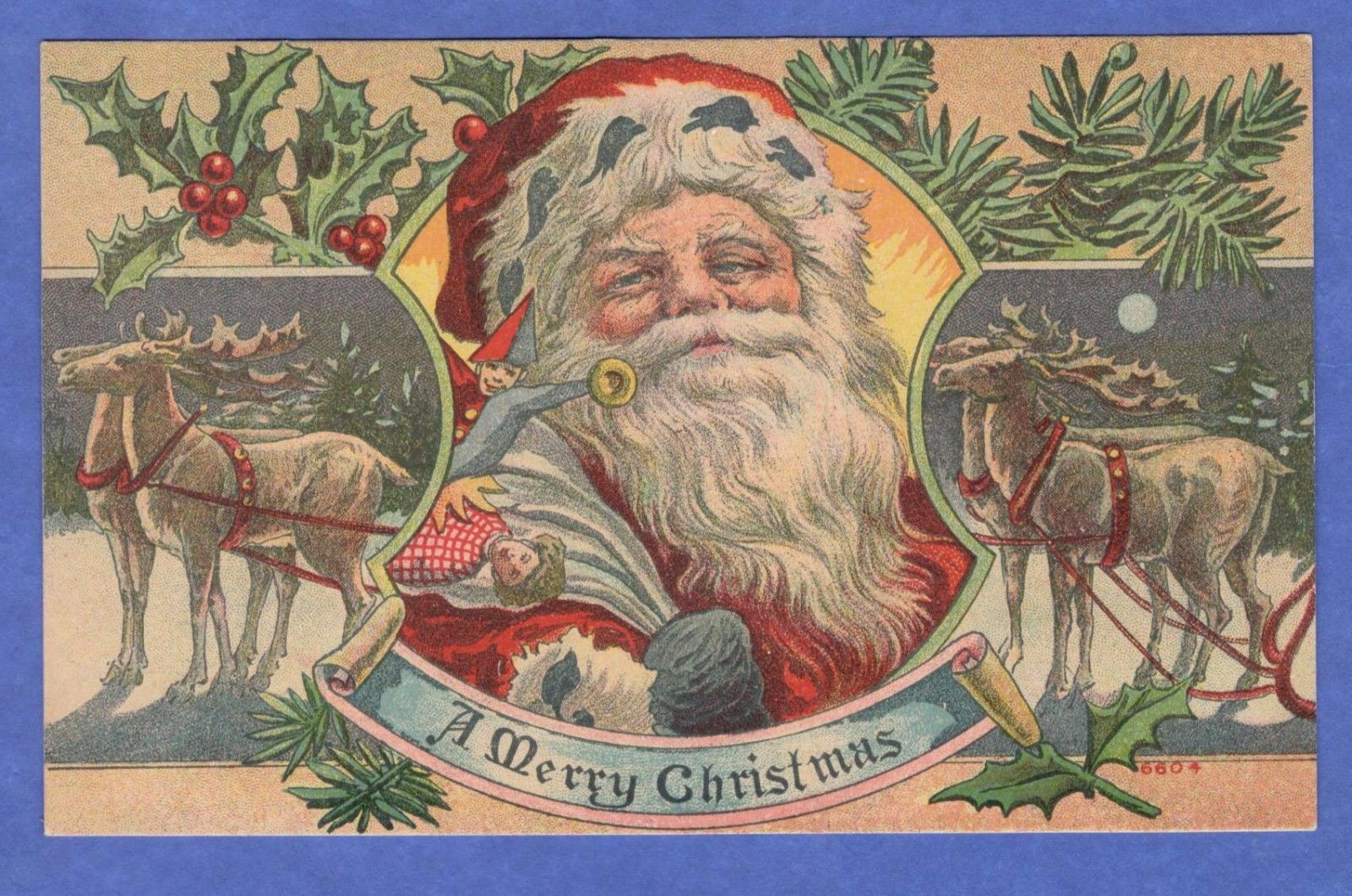 Title (ebay affiliate link): Santa, Toy Jester Doll, Reindeer Holly Leaves On Fur Of Hat Christmas Postcard