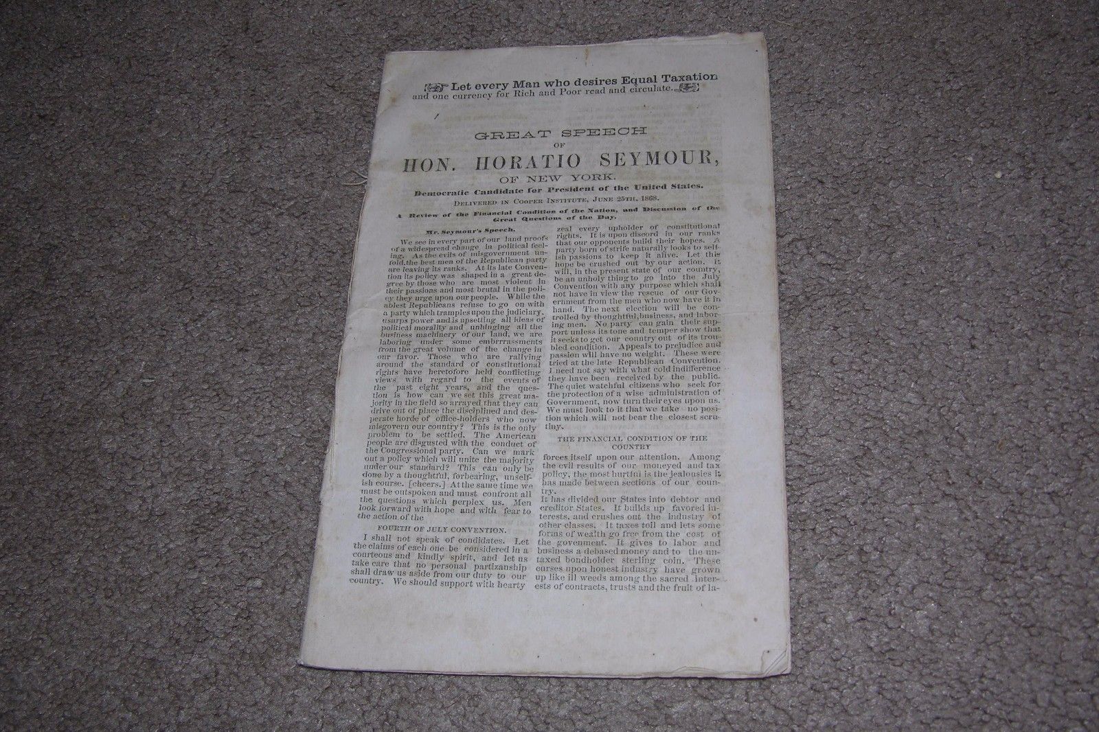 Title (ebay affiliate link): 1868 Great Speech of Hon. Horatio Seymour of New York on Equal Taxation