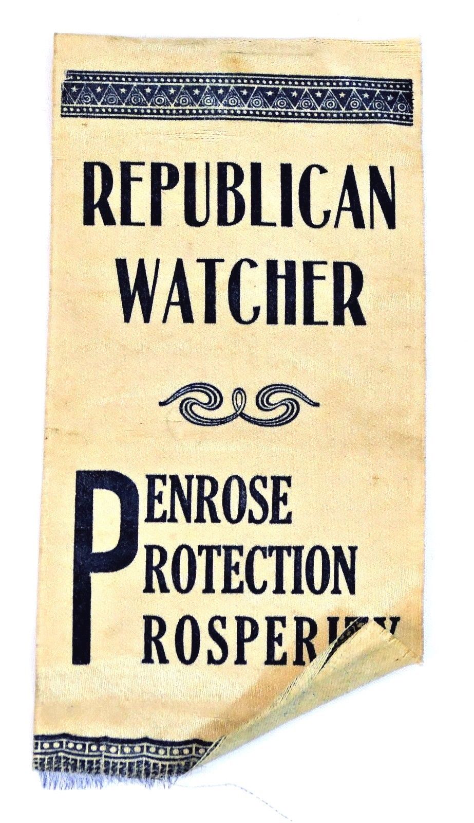 Title (ebay affiliate link): Antique US Senate ~Boies Penrose~ Republican Watcher Campaign Silk Ribbon Pin