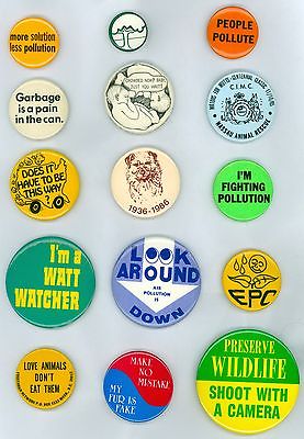 Title (ebay affiliate link): 15 Vintage 80s Ecology Animal Rights Cause Pinback Buttons Fighting Pollution