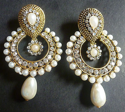Title (ebay affiliate link): Antique Gold Plated Pearl Round Drop 3 cm Indian Wedding CZ Jhumka Earrings Set