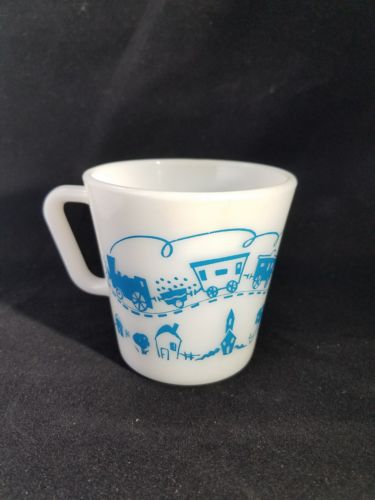 Vintage Pyrex Milk Glass Blue Train Child''s Mug 1410