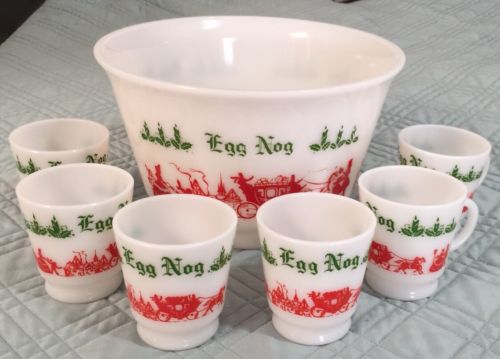 Title (ebay affiliate link): Hazel Atlas Red & Green Sleigh Village "Egg Nog" Bowl w 6 Cups Milk Glass MINT