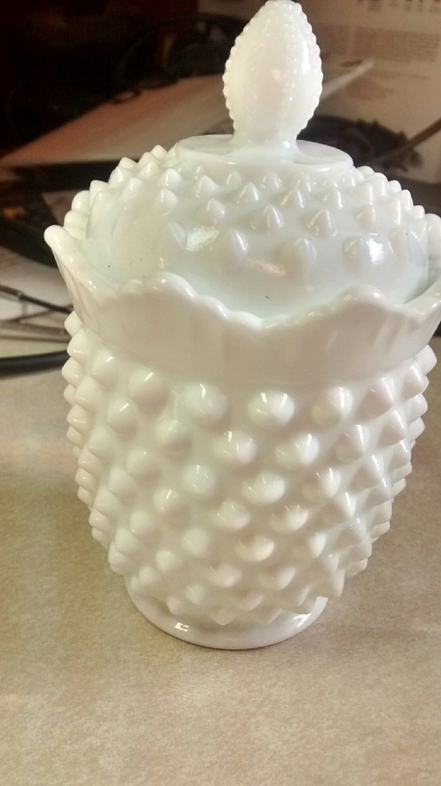 Title (ebay affiliate link): Vtg Fenton Hobnail White Milk Glass Lidded Sugar Bowl 5 7/8x3 5/8