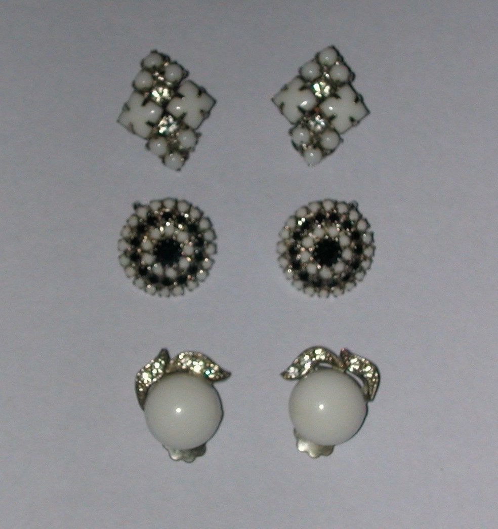 VINTAGE LOT OF 3 PAIR MILK GLASS RHINESTONE CLIP EARRINGS